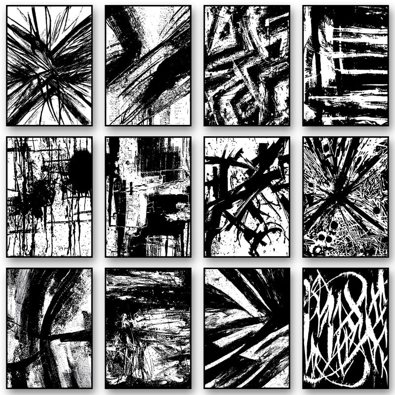 Cada ilustración está meticulosamente diseñada para capturar la esencia de la abstracción en su forma más pura. El uso del blanco y negro crea un impacto visual impactante, mientras que los efectos de salpicado o brochazos añaden dinamismo y movimiento a cada obra.