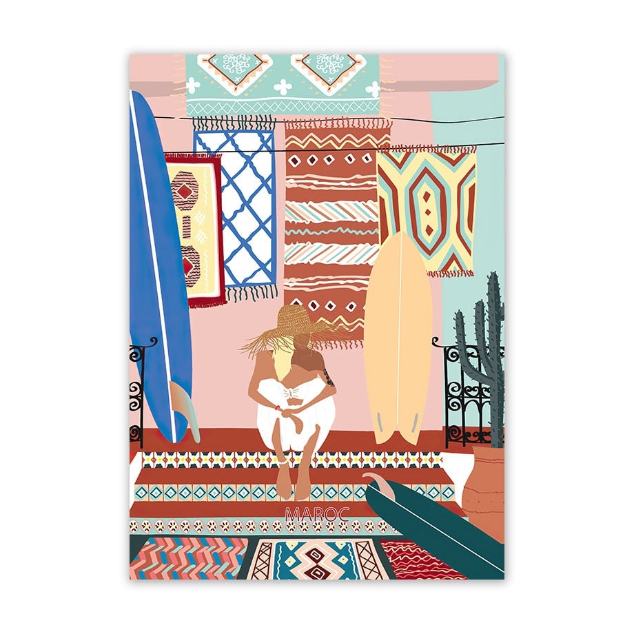 Descubre nuestra exclusiva colección de ilustraciones dedicadas a las mujeres amantes del surf. Cada obra de arte ha sido cuidadosamente diseñada para capturar la esencia de la mujer surfista y transmitir un mensaje poderoso de individualidad, calma y seguridad.